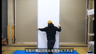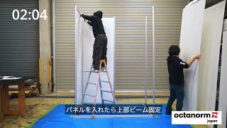 エキシビション・システムの最大の特徴は組立・解体の簡易性です。ビームに内蔵されたテンションロックを180度回転させてポールに接続、アルミフレームに4mm厚の木工システムパネルを差し込んで壁面を構築します。