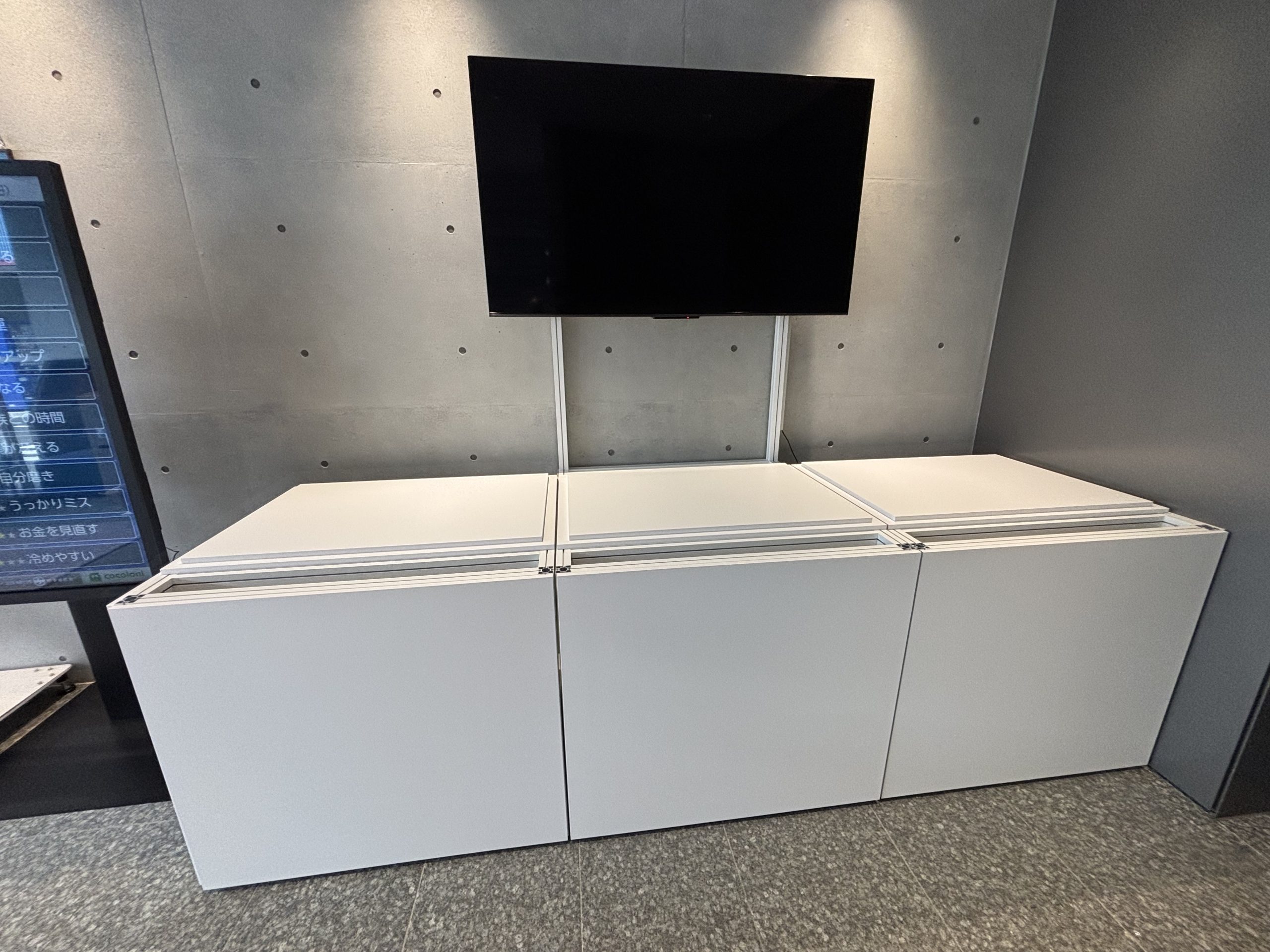【導入事例】モニター付き展示台(マグネット付き化粧板+マキシマ)