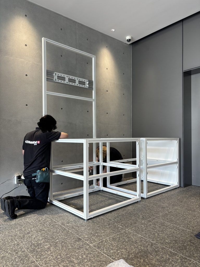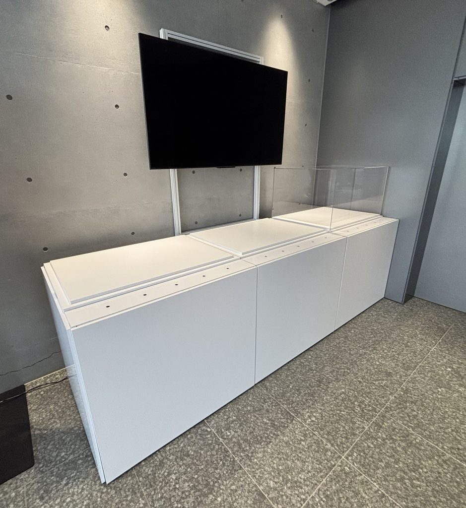 シンプルでありながら強度と柔軟性を兼ね備えた展示台です。 どんな空間にもマッチする洗練されたデザインで、パネルや棚、照明などさまざまな要素を自由自在に取り付けられます。 65インチのモニターは約25Kgの重量がありましたが、マキシマ40角を展示台と一体化させることで、強度は十分保つとことが出来ました。 カスタムでモニター台+収納付き展示台+ショーケースの製作事例です。