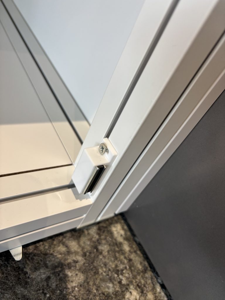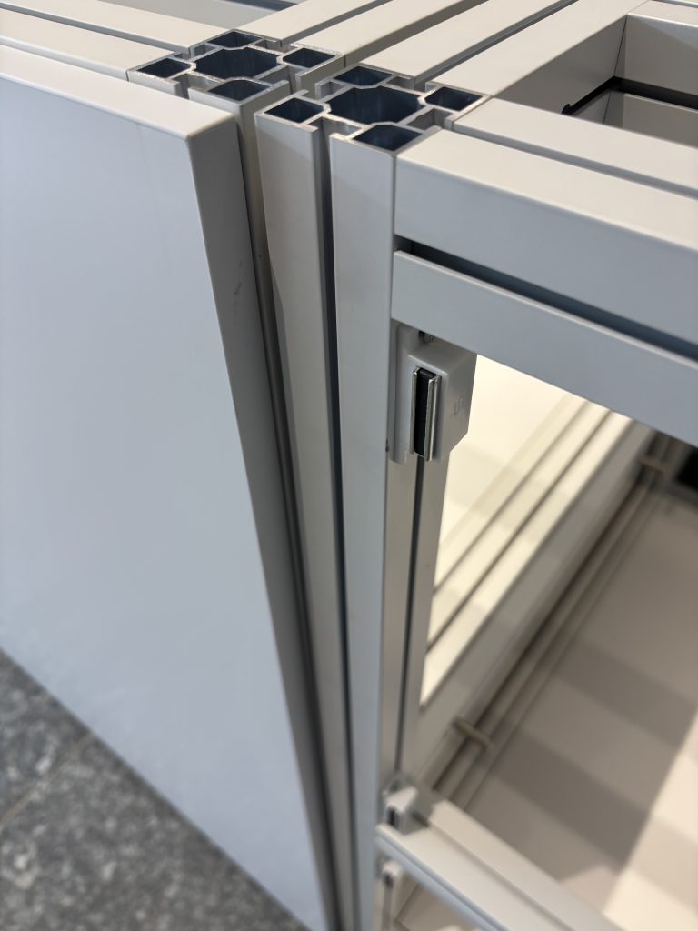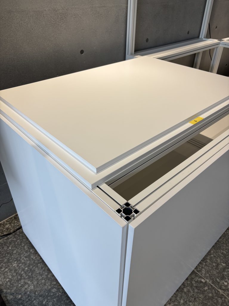 「工場っぽさを感じさせない展示台を作りたい!」 このようなクライアントのご要望から、マキシマのアルミフレームを見えなくするデザインで設計。 化粧板とマキシマにマグネットを取り付けることで、オリジナルの仕様に変更。 フレームが隠れることで、スタイリッシュな外観演出を実現。 加えて、マグネットを採用したことで化粧板の付け外しが出来、内部に収納スペースが出来る。